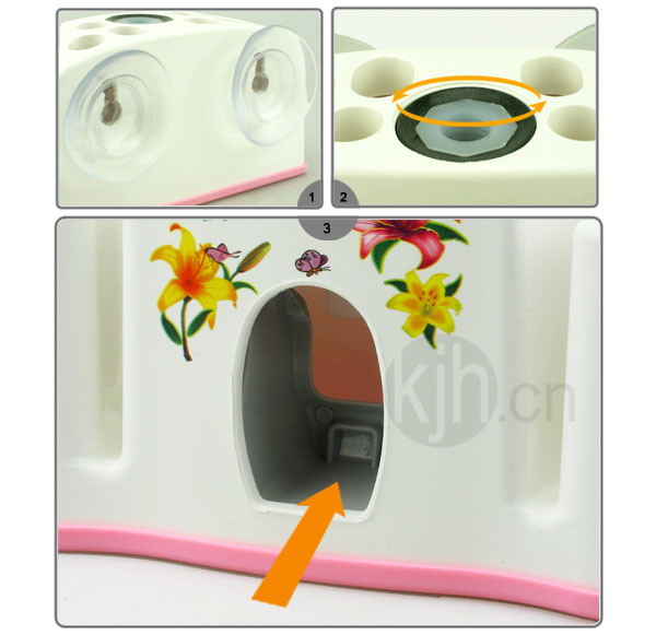 - 1.產(chǎn)品背部附強(qiáng)力吸盤(pán),可固定在玻璃或光滑表面,更省空間。