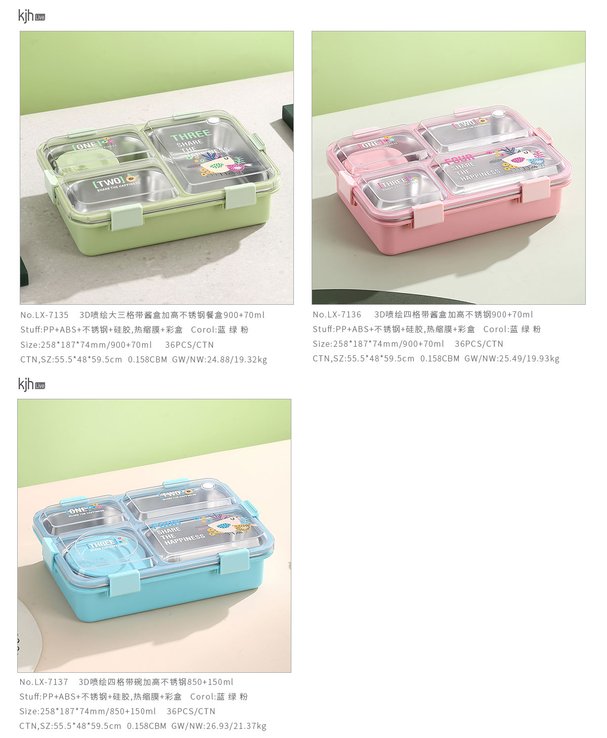 Size: LX-7135(大三格帶醬盒):258*187*74mm/900+70ml