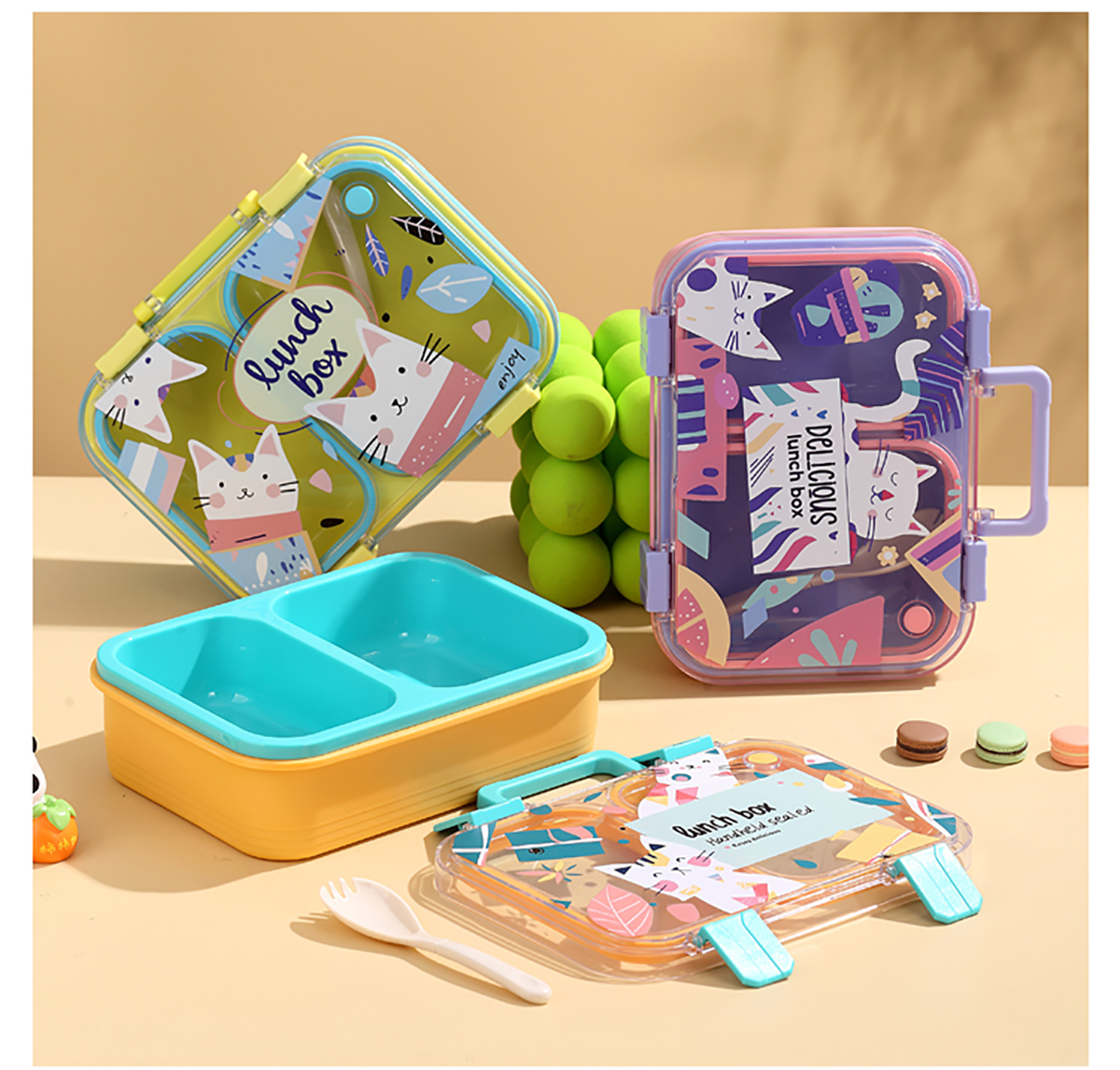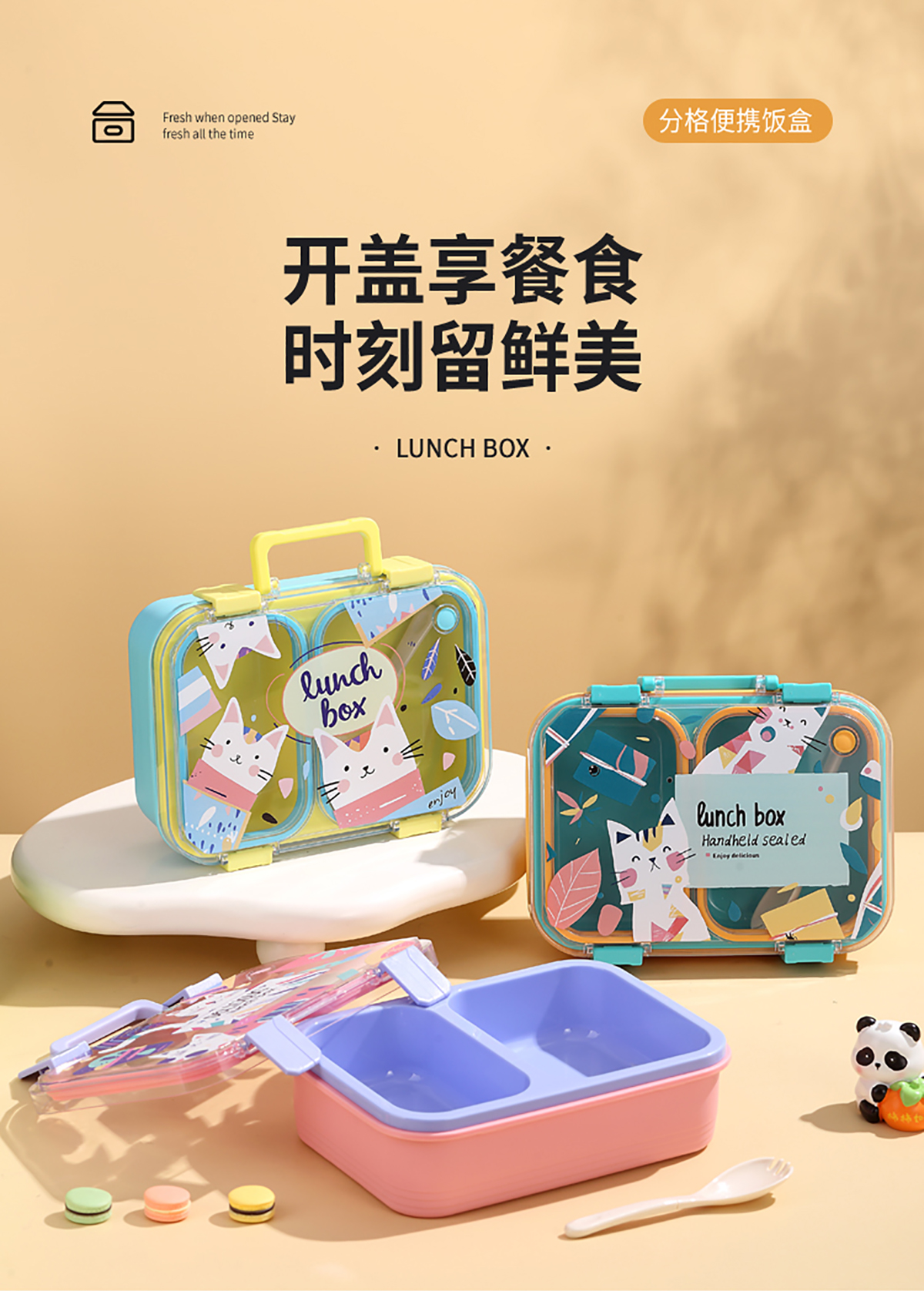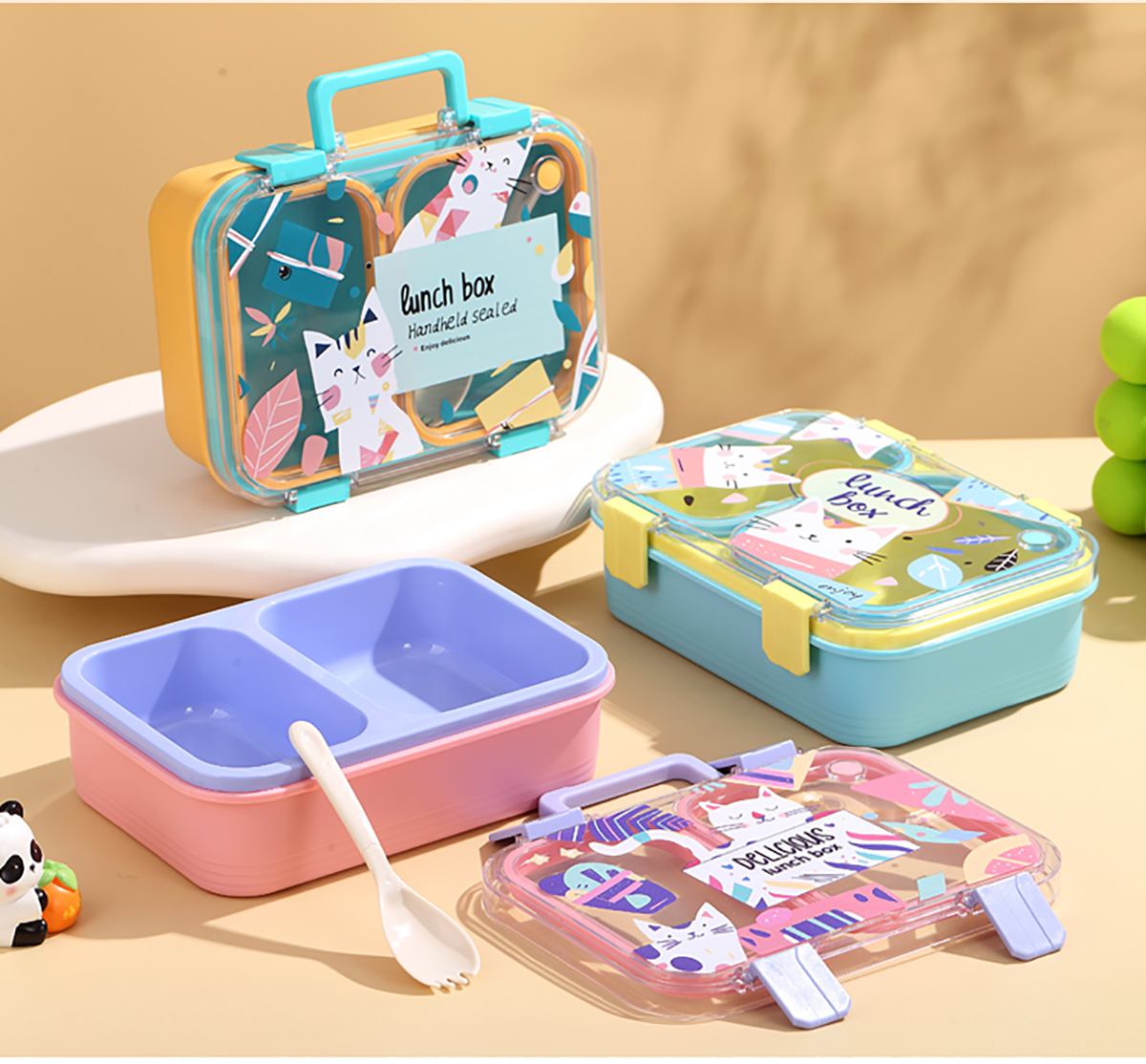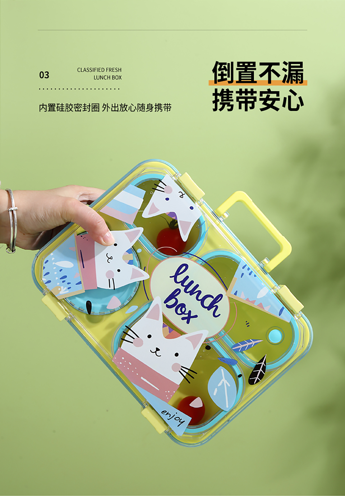 手提卡通貓獨(dú)立密封二格/三格/四格帶碗塑料餐盒