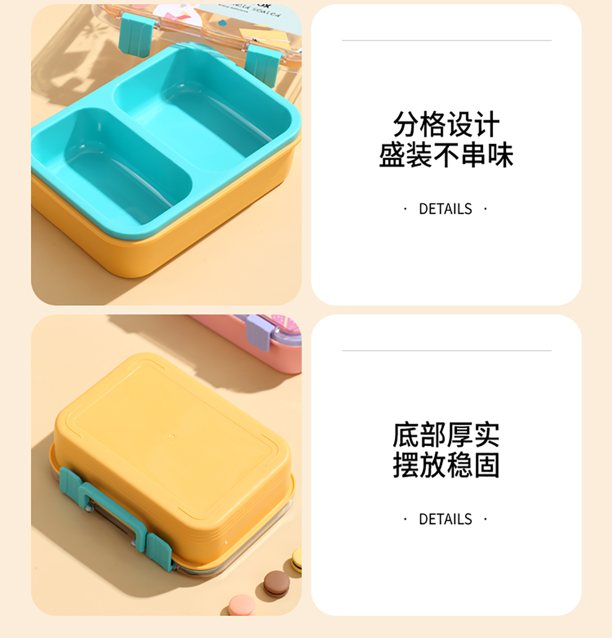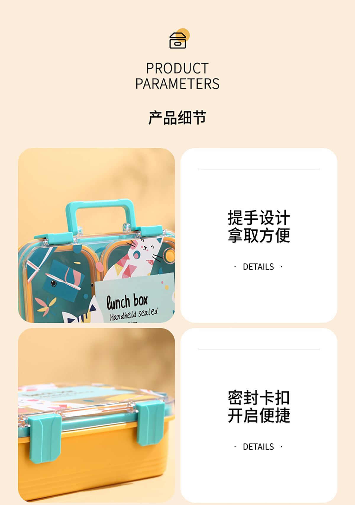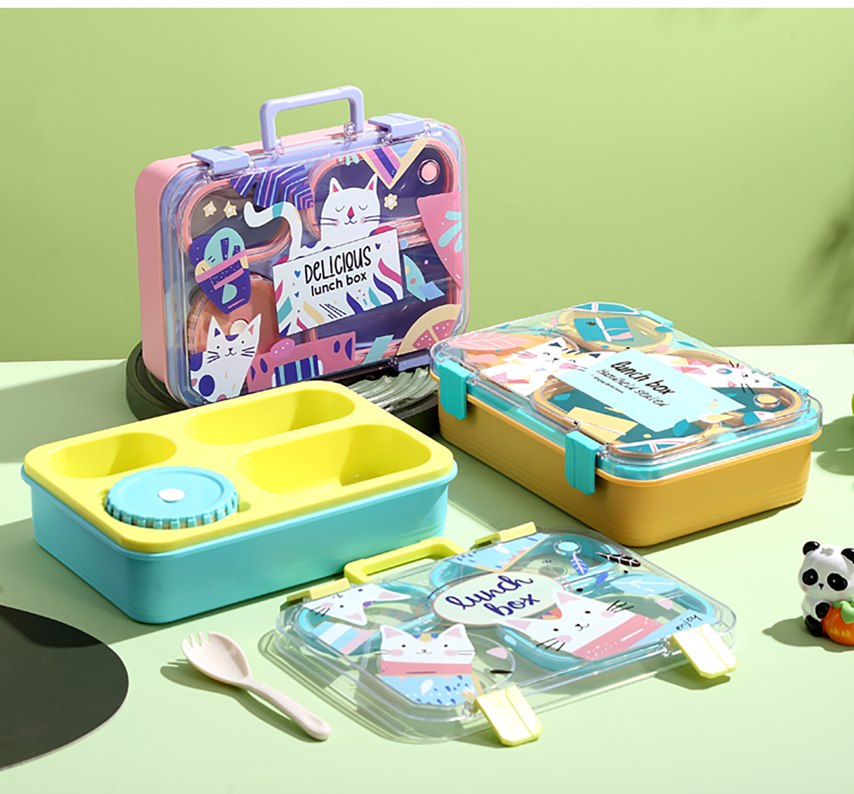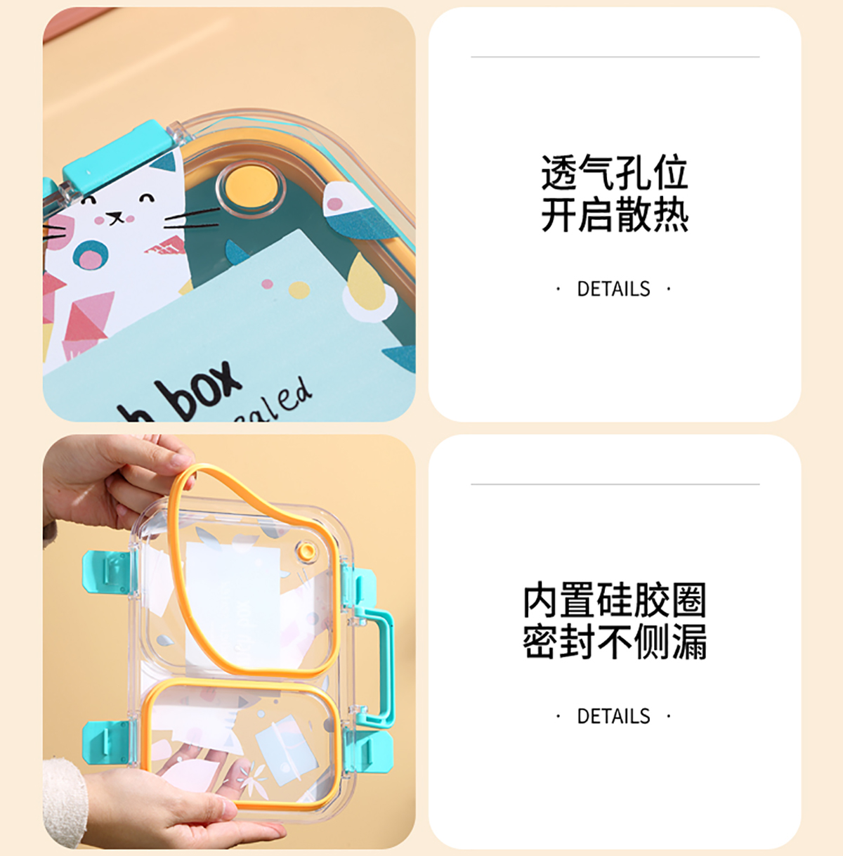 手提卡通貓獨(dú)立密封二格/三格/四格帶碗塑料餐盒