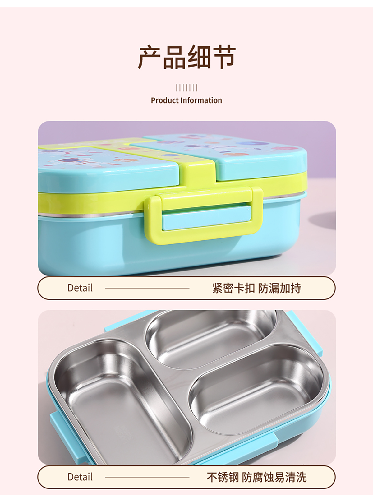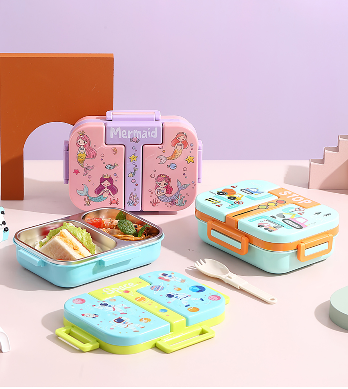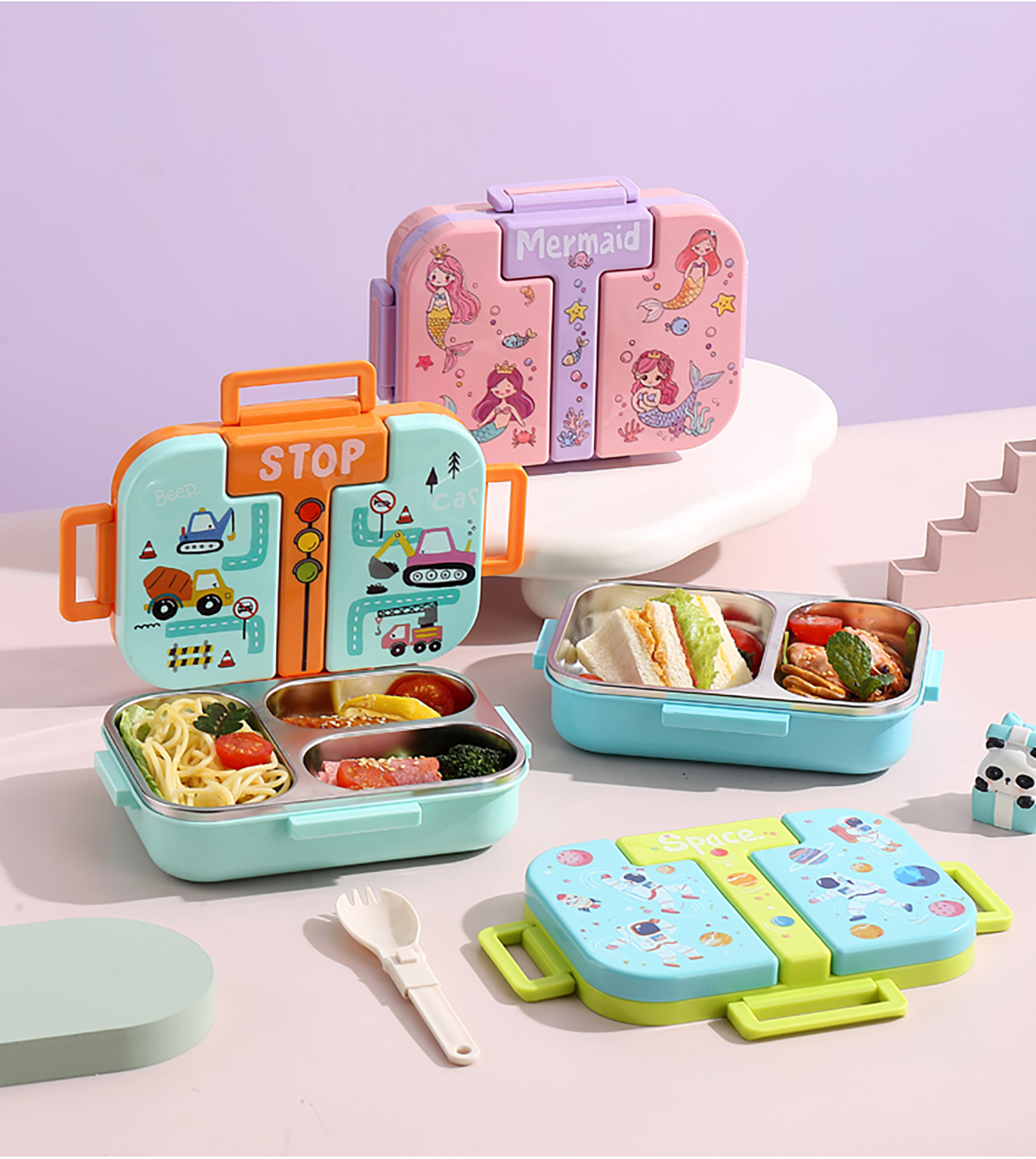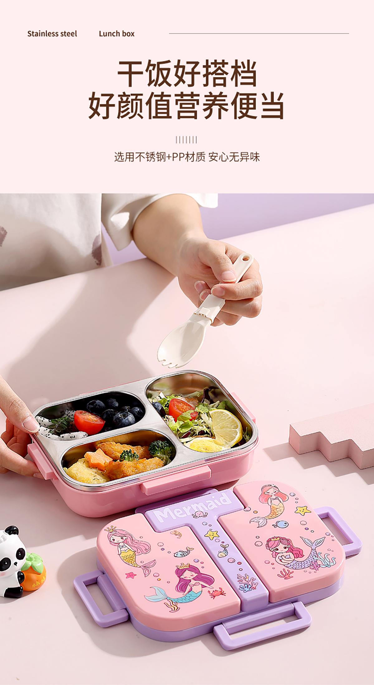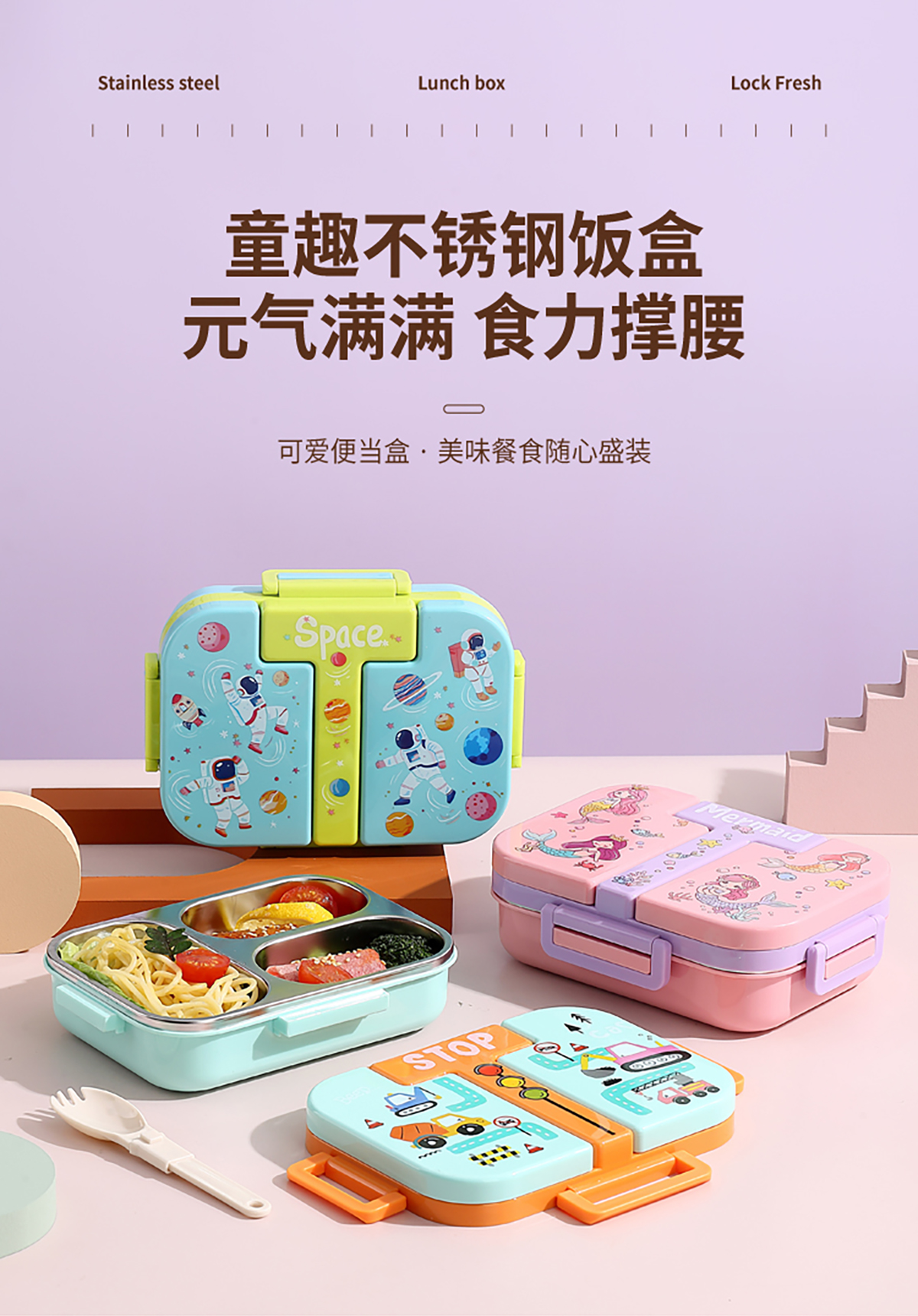 600ml 獨(dú)立密封童趣不銹鋼餐盒2格/3格 (配PP折疊湯勺)